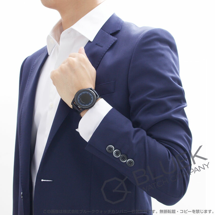 中でも短い黒針1本(赤は秒針)で時と分が同時に読み取れるこの43ミリフルブラックモデルは、レールウェイ内周に時表示のアラビア数字、外周に1時間毎に00、45、30、15の分目盛りを備えたユニークなディスクダイヤルが魅力。